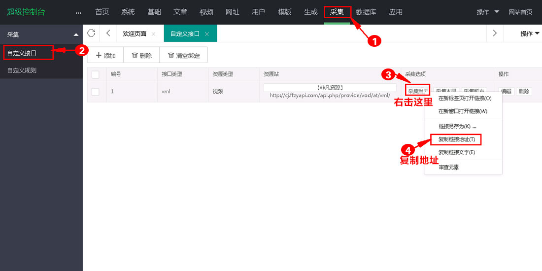请按照下图所示打开添加采集页面并添加采集api
